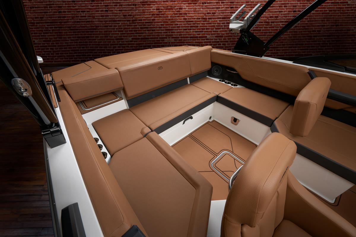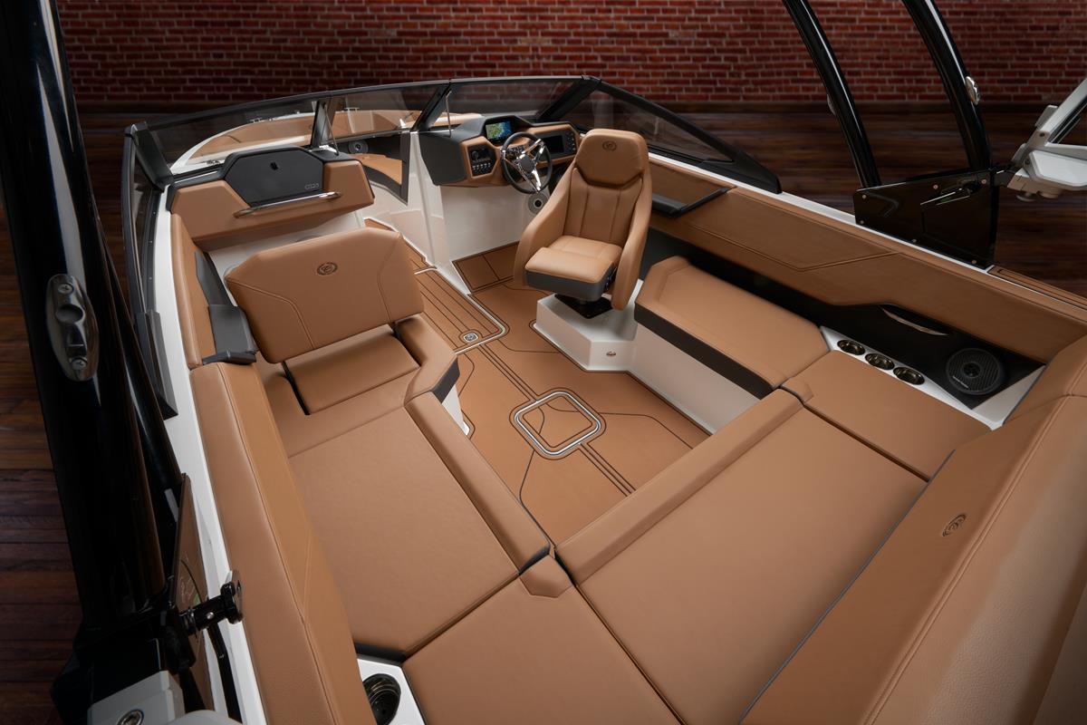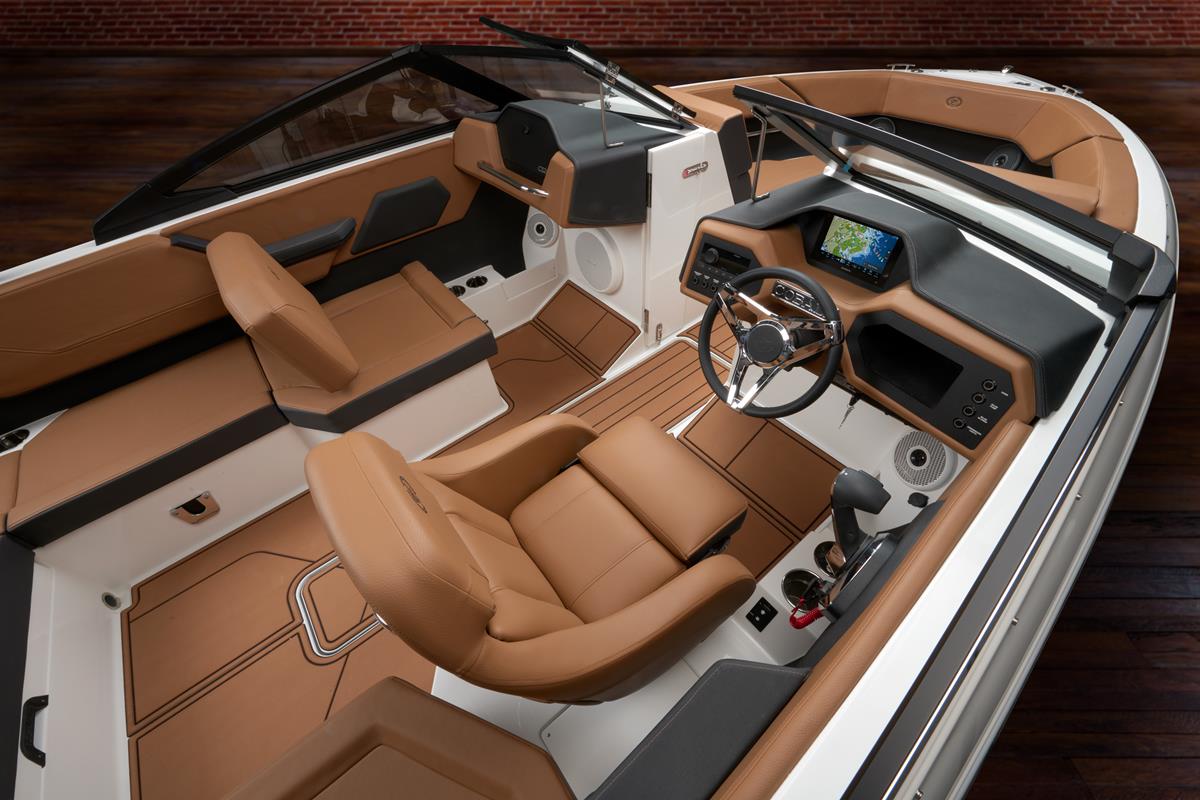 Binnenin valt meteen op hoe ruim en doordacht de indeling is. Dankzij de hoogwaardige Fresco-Chill bekleding, die koeler blijft in de zon, geniet je van ongeëvenaard comfort tijdens warme zomerdagen. De verstelbare zit- en loungemogelijkheden, het moderne dashboard en de premium audio-opties creëren een ontspannen én stijlvolle vaaromgeving.