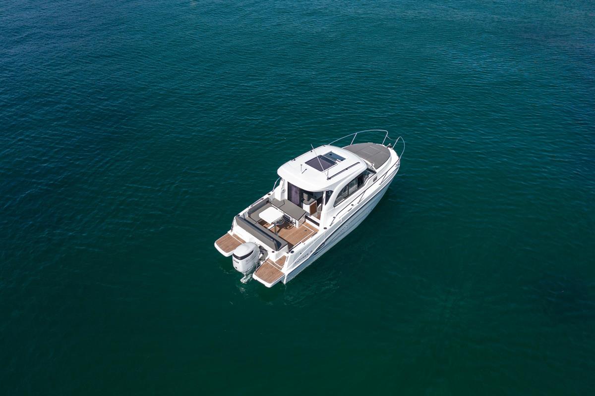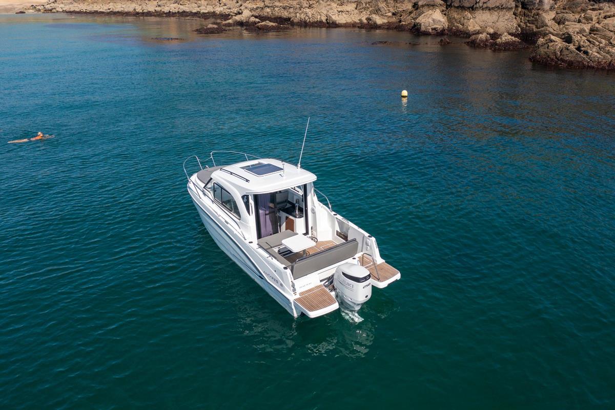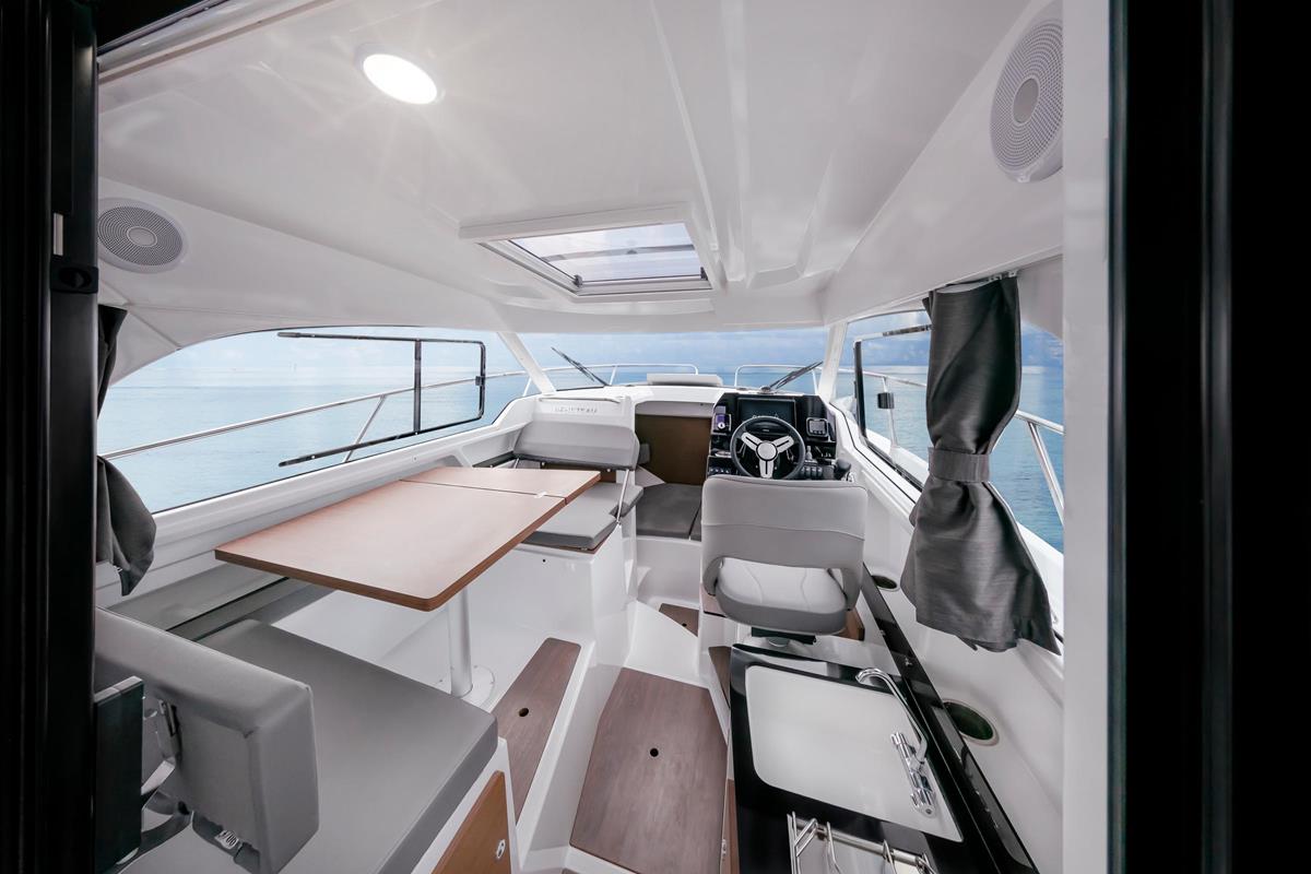 À l'intérieur, les passagers trouveront un espace de vie confortable avec de grandes fenêtres, une cuisine compacte et un coin salon convertible. À l'avant se trouve une cabine double confortable, complétée par une salle d'eau séparée (WC/douche) selon la configuration choisie. À l'extérieur, le cockpit modulaire permet de passer facilement du farniente au repas ou à la pêche.