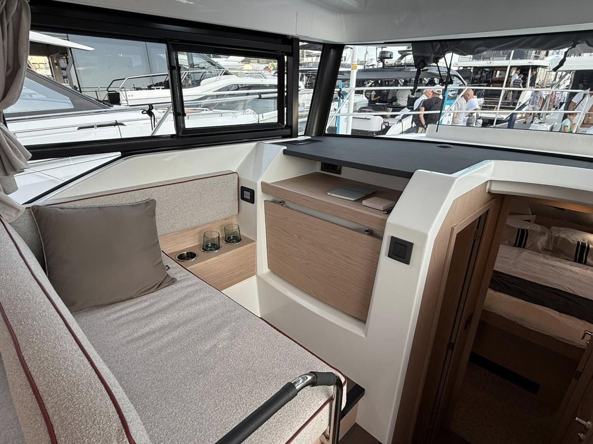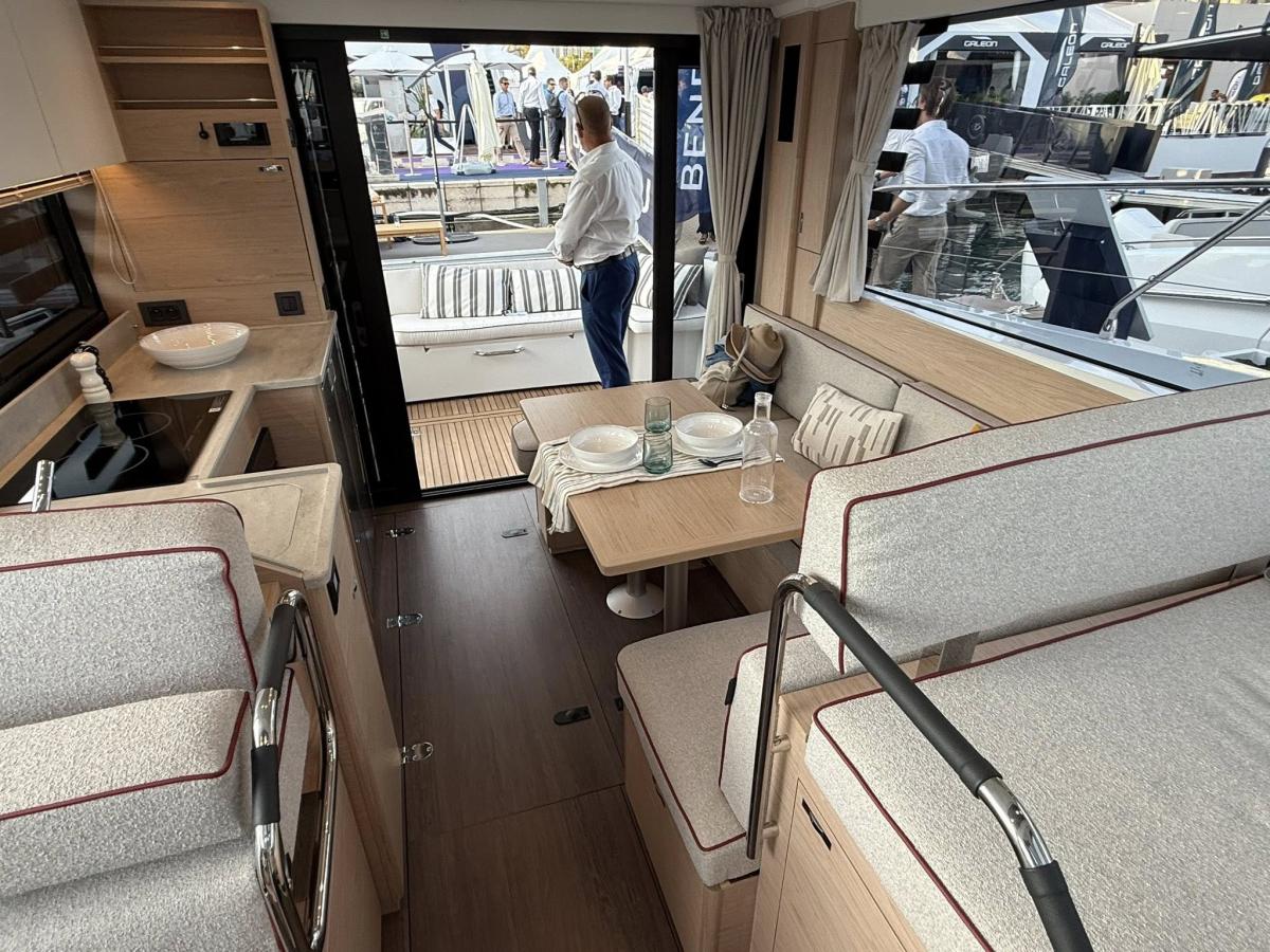 L'interaction sociale est au cœur de la conception du pont, avec une cuisine en U et une banquette qui créent une sensation d'espace. Cela est renforcé par des possibilités de rangement considérables et un grand réfrigérateur et congélateur. La banquette peut être rapidement transformée en lit double avec un rideau d'intimité. Nous avons également introduit une table pliante innovante qui peut être transformée de manière intelligente en un espace de travail confortable. À l'étage inférieur, l'accent est mis sur la cabine propriétaire spacieuse et la salle de bains principale avec des portes Jack & Jill et une cabine de douche séparée. La cuisine et la salle de bains sont équipées de série de plans de travail en Corian, tandis que le nouveau pack Luxe pour l'aménagement et le confort peut encore améliorer la vie à bord.