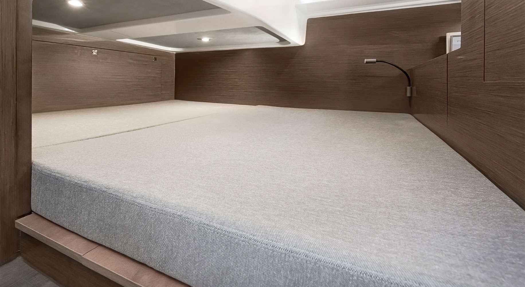 Le Gran Turismo 32 dispose de deux couchettes doubles et d'une véritable salle d'eau avec un compartiment principal indépendant, ce qui rend les nuits à bord confortables et relaxantes. Baignées par la lumière douce des longues fenêtres de la coque, la cabine principale centrale et la cabine intermédiaire peuvent toutes deux utiliser la spacieuse colonne de rangement située au bas de la timonerie. L'espace est mis en valeur par des matériaux élégants, de couleur noyer.