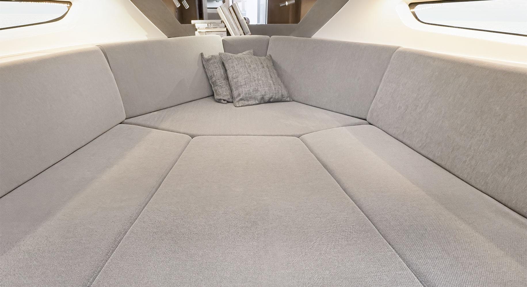 Dans le cockpit, l'aménagement complet du Gran Turismo 32 assure une utilisation optimale de l'espace. Le dossier du siège et la banquette arrière basculent vers l'arrière pour créer un grand bain de soleil. A l'avant, une chaise longue pour 3 personnes est accessible facilement et en toute sécurité par le semi-walkaround.