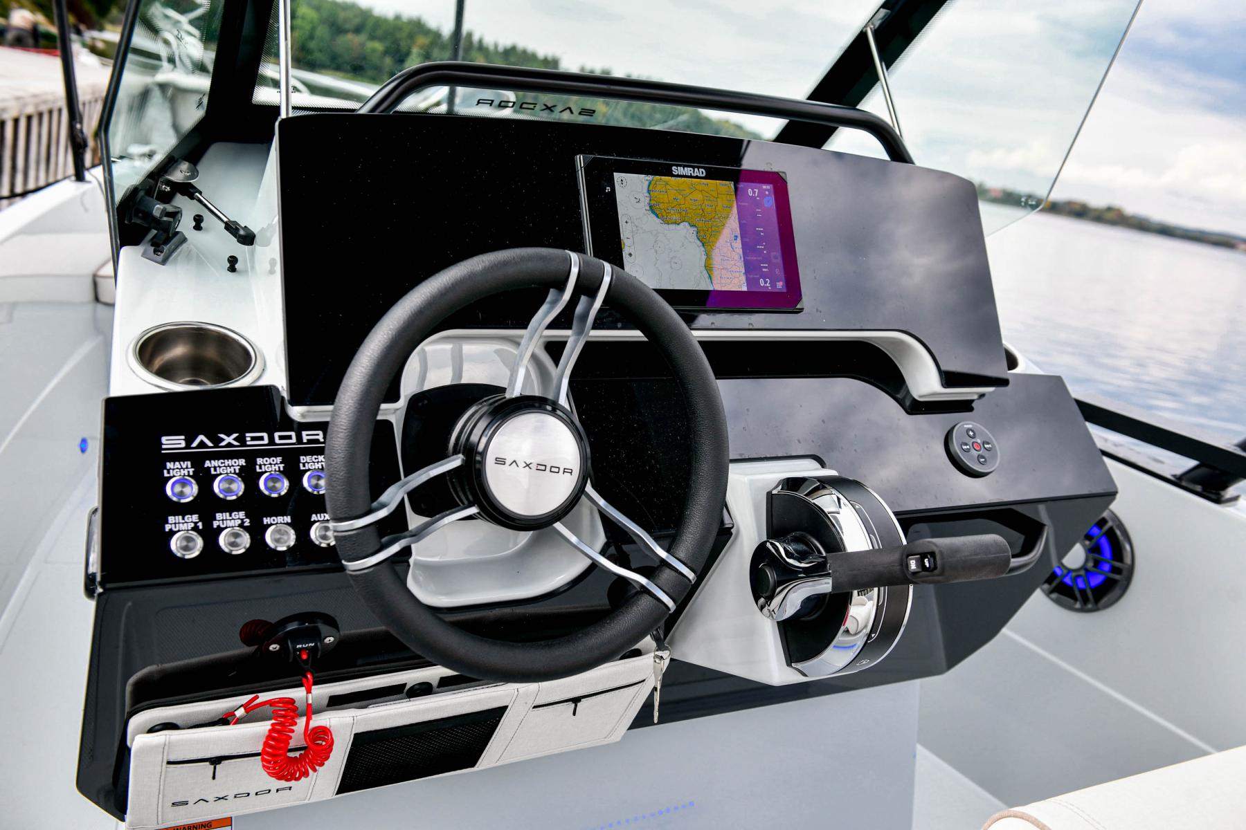 Terwijl de enkele buitenboordmotor van 100 pk een topsnelheid van 34 knopen haalt, levert een Mercury V6 van 175 pk 45+ knopen. De stuurconsole biedt een futuristische look met de verlichte roestvrijstalen schakelaars en de optionele enkele of dubbele negen-inch Simrad touchscreen MFD. Met deze ultramoderne gebruikersinterface heeft men op één plaats toegang tot navigatie, audioapparatuur of motorinformatie.