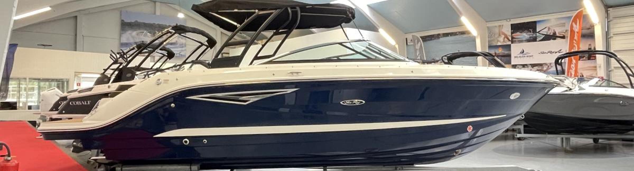 Magnifique Searay 250 SLX neuf équipé d'un moteur Mercury Searay de 350 CV, coque bleue avec ligne de flottaison blanche et intérieur luxueux Dune.