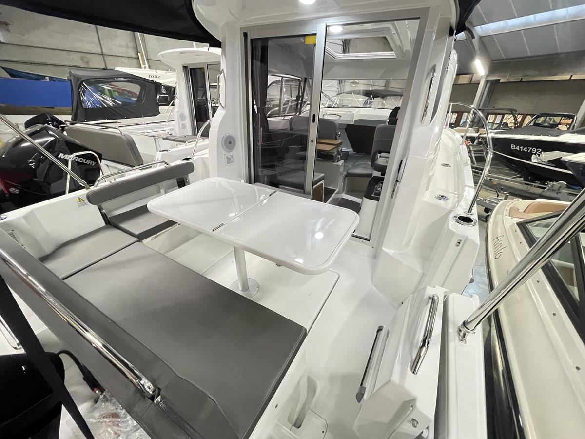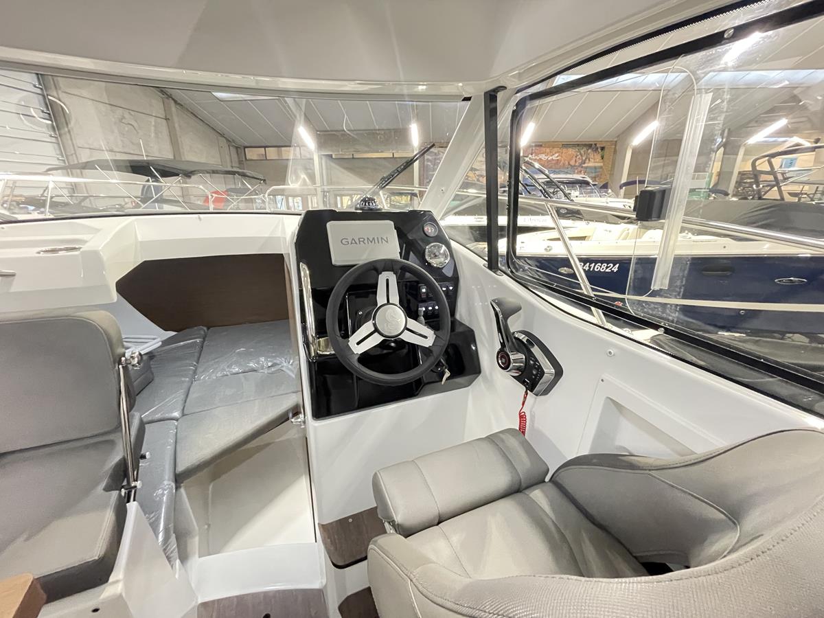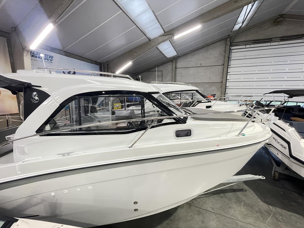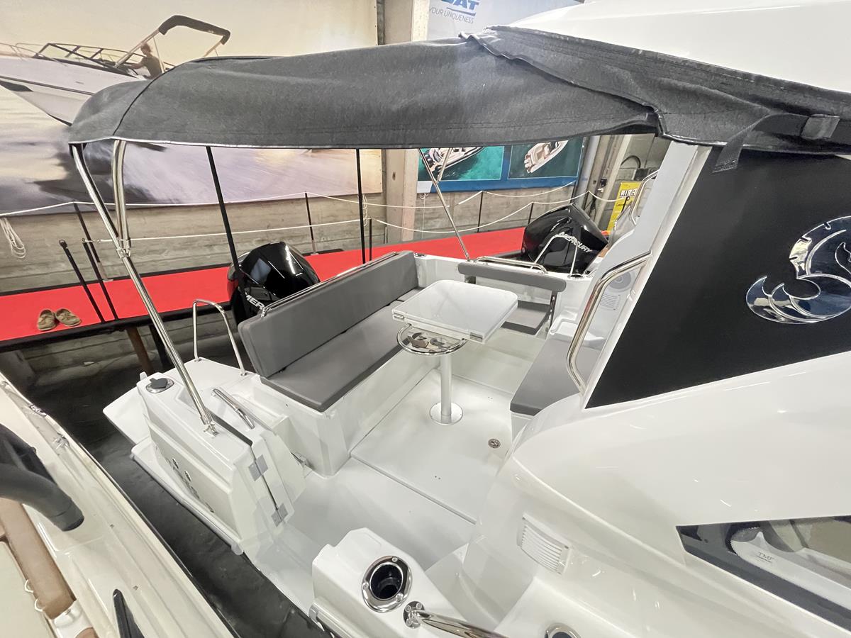 Binnen geniet je van een lichte salon met panoramisch zicht, een praktische keuken met zwart aanrecht, koelkast ,extra berging  en een comfortabele boegkajuit voor overnachtingen. Buiten is de kuip veelzijdig en uitnodigend: de cockpit kan eenvoudig worden omgevormd tot een groot zonnedek, ideaal om te loungen en te genieten tijdens mooie dagen op het water. De 220V-walstroomaansluiting biedt extra comfort voor langere verblijven aan boord.