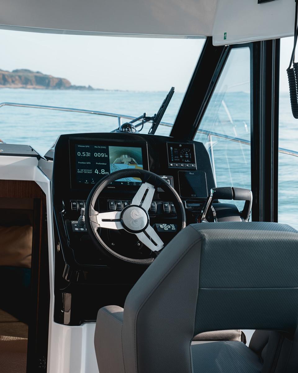 De nieuwe Antares 9 heeft een elegant profiel en beschikt over strakke, krachtige lijnen, versterkt door een zilveren stootrand en lange rompramen. De stuurhutboog, een echt kenmerk van de lijn, vormt een licht gebroken curve. Deze sluit aan op het uitgebreide coachroof dat de royale achterste cockpit (1,7 m bij 2,4 m) beschermt. Door een extra stoel toe te voegen, kan de L-vormige bank worden omgebouwd tot een U-vormige salon, de ideale indeling voor een groot aantal gasten. Deze modulaire salon kan eenvoudig worden omgebouwd tot een zonneweide wanneer u wilt ontspannen en zonnebaden.