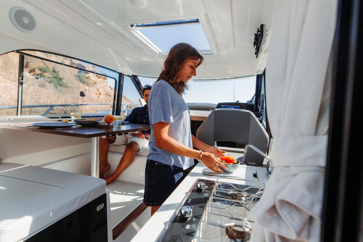 De nieuwe Antares 9 is perfect geschikt voor cruises met familie of vrienden en biedt haar passagiers een opmerkelijke kwaliteit van leven aan boord. Omringd door grote ramen baadt de binnenlounge in het licht. De moderne kombuis is uitgerust met een koelkast van 80 liter, twee elektrische kookplaten, een optionele magnetron en veel opbergruimte.