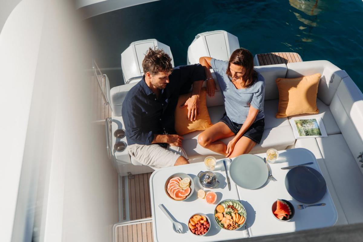 De toegangsdeur aan de zijkant maakt het gemakkelijker om in en uit te stappen, terwijl de zwemtrap gemakkelijke toegang tot het water biedt. De bredere, diepere gangboord aan stuurboord, met hoge preekstoelen, zorgt voor een veilige doorgang naar het voordek om de ankerkluis te openen, toegang te krijgen tot het ponton of te genieten van een pauze in de zon op de zeer comfortabele zonnebedden, compleet met verstelbare rugleuningen. Elke innovatie is ontworpen om beweging gemakkelijker te maken en naadloze toegang tot de zee te bieden, zodat uw reizen comfortabeler, ontspannender en plezieriger zijn.