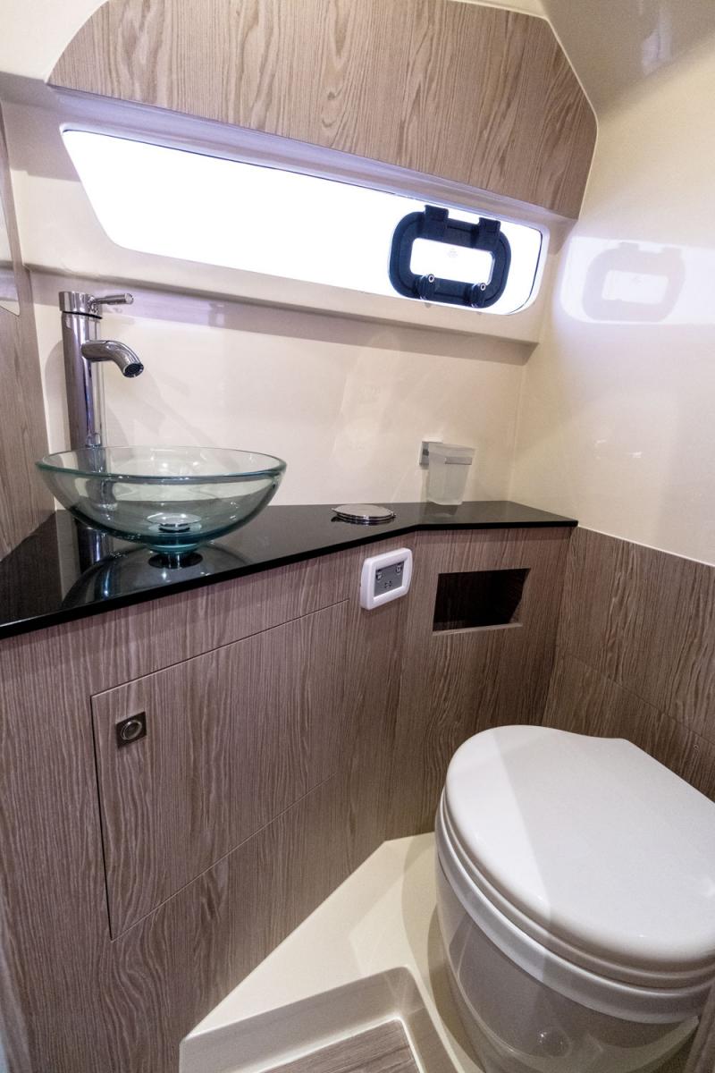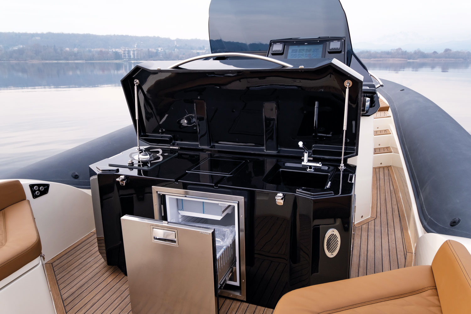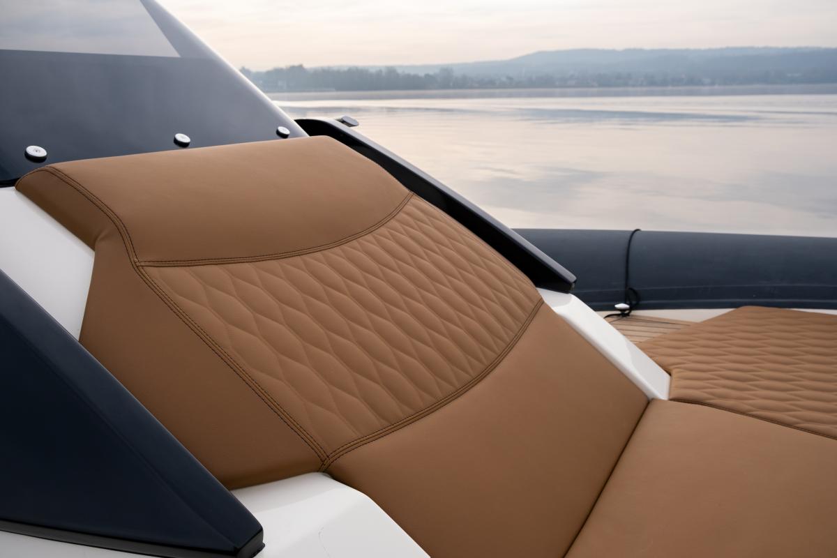 Hoewel de boot een moderne indeling heeft, respecteert hij de kernwaarden van het bedrijf vanaf de achtersteven, waar de drijvers constant het water raken om onder alle omstandigheden stabiliteit te bieden en veel comfort voor de bemanning te garanderen dankzij de dinette met elektrisch verwijderbare tafel en verlengstuk voor het zonnebed.