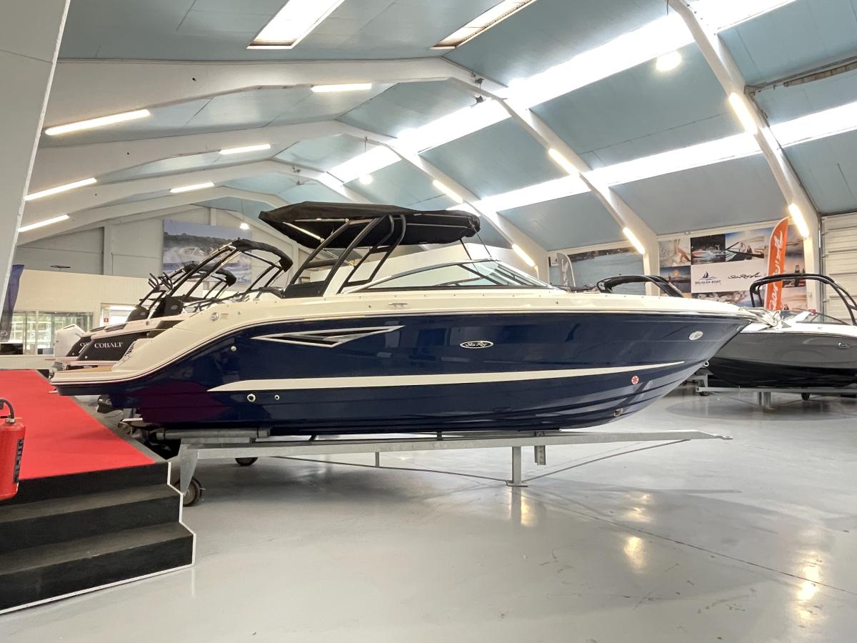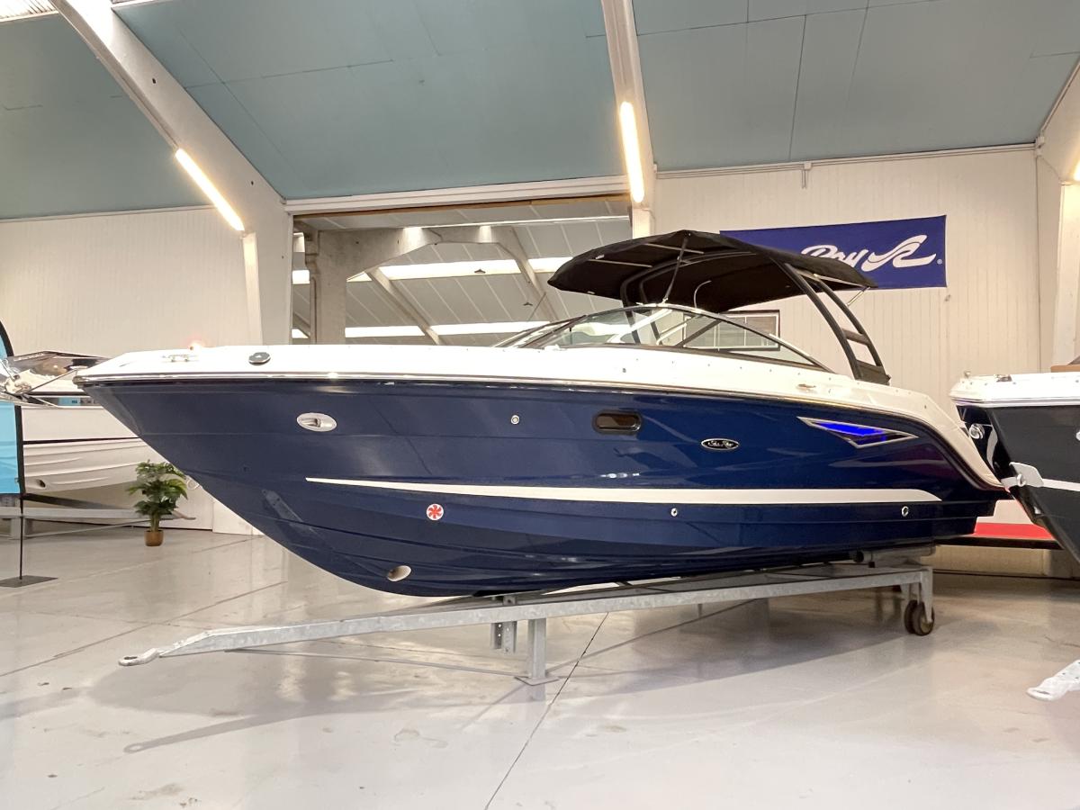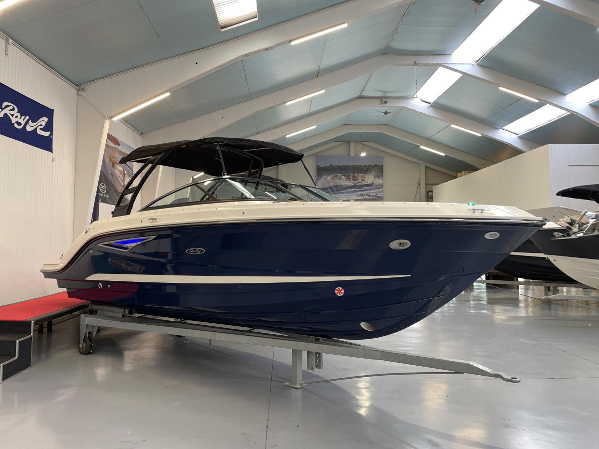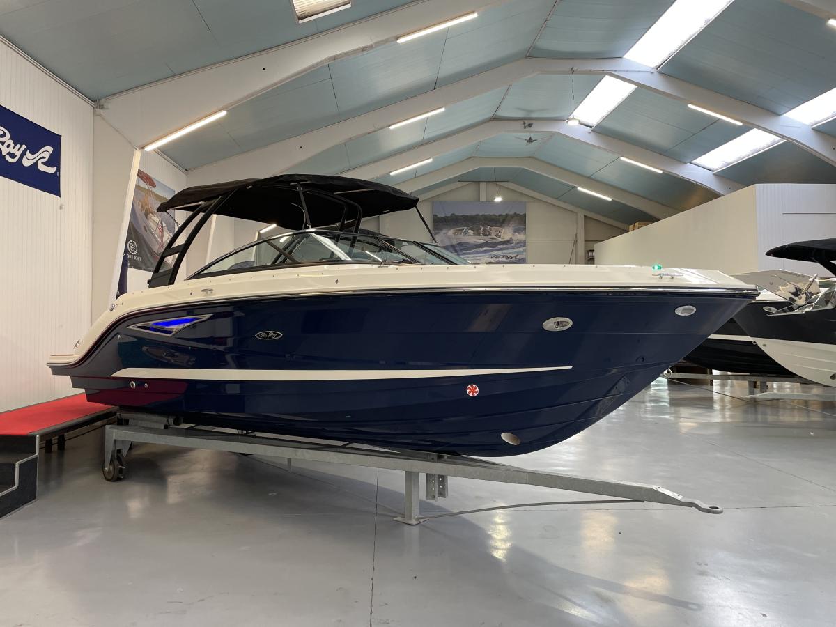 Prachtige nieuwe Searay 250 SLX uitgerust met 350 PK Mercury Searay blauwe romp met witte waterlijn en luxe Dune interieur.