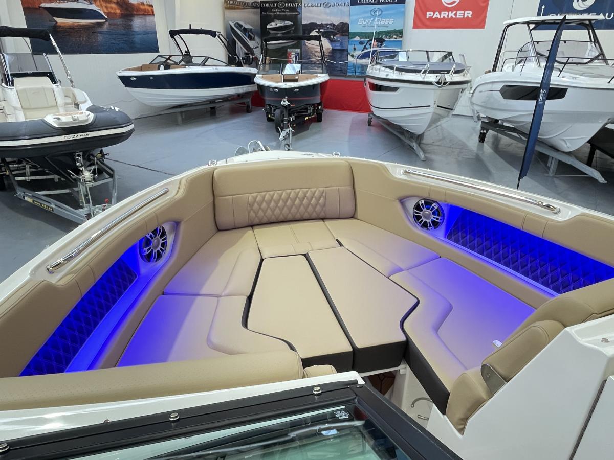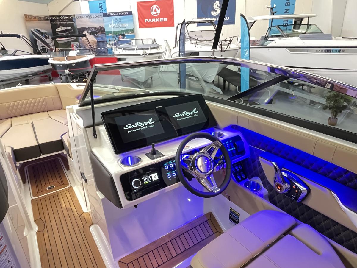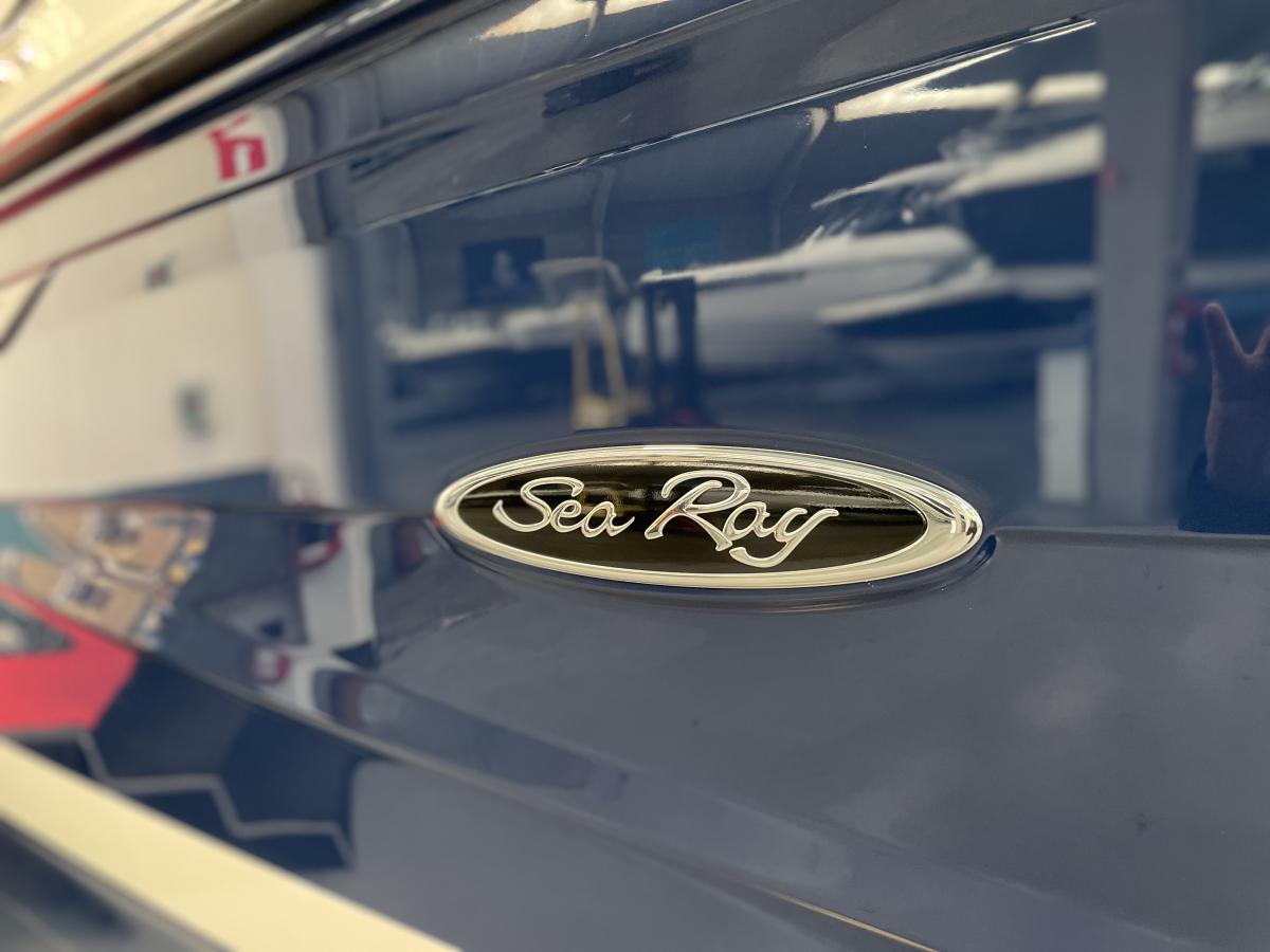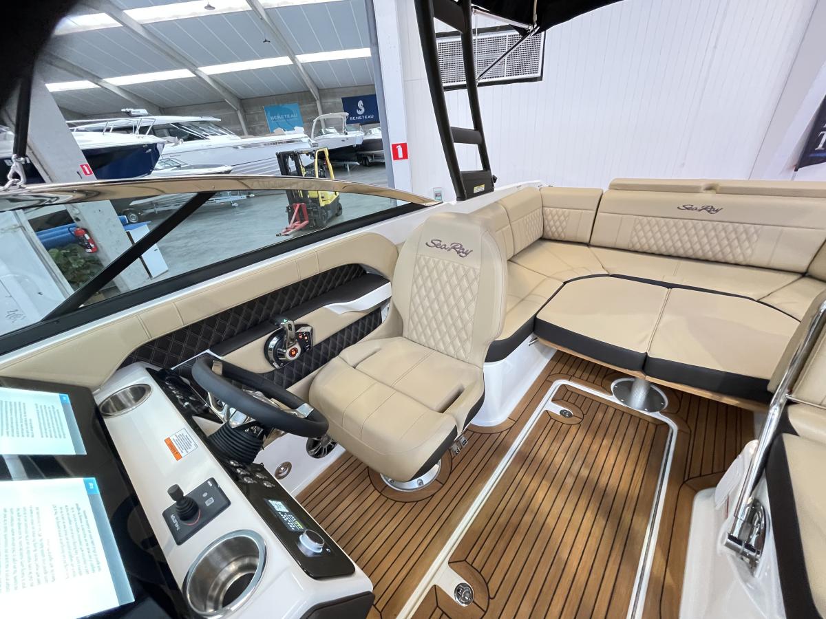 Prachtige nieuwe Searay 250 SLX uitgerust met 350 PK Mercury Searay blauwe romp met witte waterlijn en luxe Dune interieur.