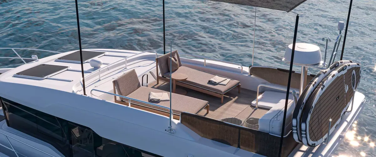 De moderne sedanconfiguratie introduceert een geheel nieuw concept van adaptieve vloeroppervlakte. Of u nu van een actieve levensstijl houdt of op zoek bent naar pure ontspanning, u kunt de ruimte naar eigen wens inrichten.Het open platform, dat toegankelijk is via de ingebouwde trap, biedt gemakkelijk plaats aan ligstoelen, zonneschermen en tafels voor de ideale ontmoetingsruimte. Of voor gezinnen met veel spullen en speelgoed voor water- en landactiviteiten is er een gemakkelijk toegankelijke opslagruimte.